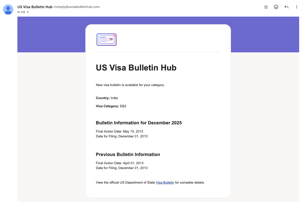 US Visa Bulletin Hub solves this problem by bringing the updates directly to your email inbox. Instead of manually checking and comparing bulletins every month, we do the heavy lifting.