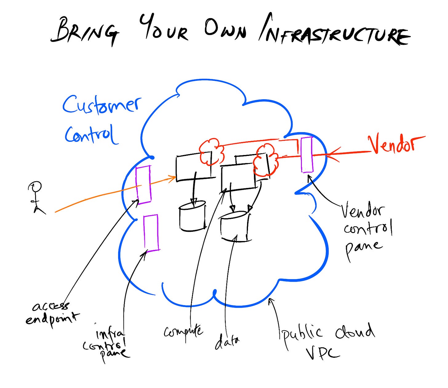 Bring your own Infrastructure is a new software deployment model where customers host and operate SaaS-like services created by vendors in the public cloud. The software vendor will not have network access to the data owned by the customer but would get access to high level operational information and partial administrative controls like being able to deploy software.