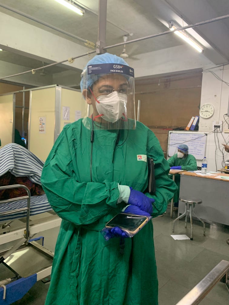 Doctors and support staff were wearing medical PPE. This includes the green gown, gloves, face-shield and importantly N95 mask. This is an intermediate protection PPE. A more protective version is an impermeable bodysuit but that makes movement too restrictive for the doctors and staff. The full PPE is a single use one and extremely uncomfortable in Indian weather conditions. They are used in this hospital only in ICU setups where there are aerosol generating procedures. The hospital has not found an increase in HCW (healthcare worker) infection rates due to this policy
