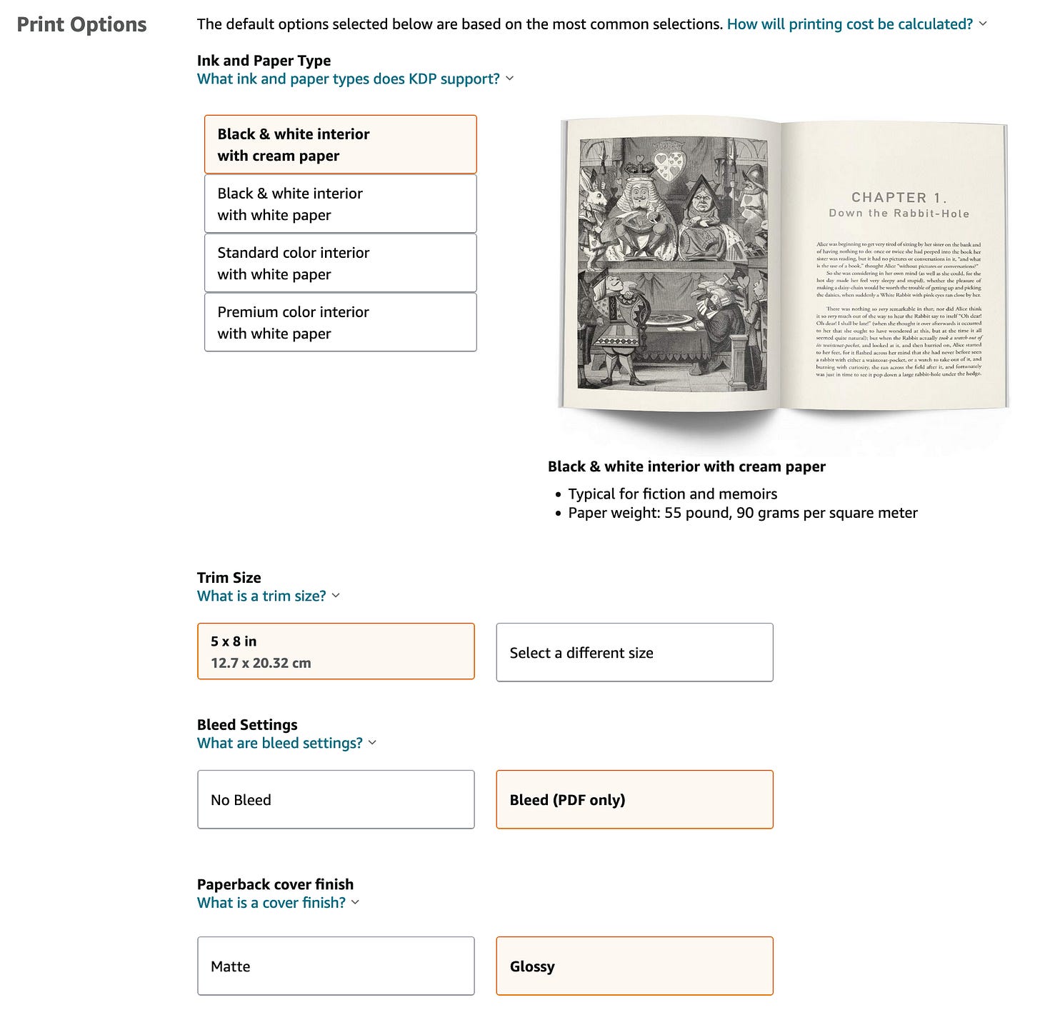 KDP supports creating books in multiple formats - ebooks, paperbacks and hardcovers. Physical paperbacks and hardcover books are printed on demand with no upfront capital requirements. More on pricing below.