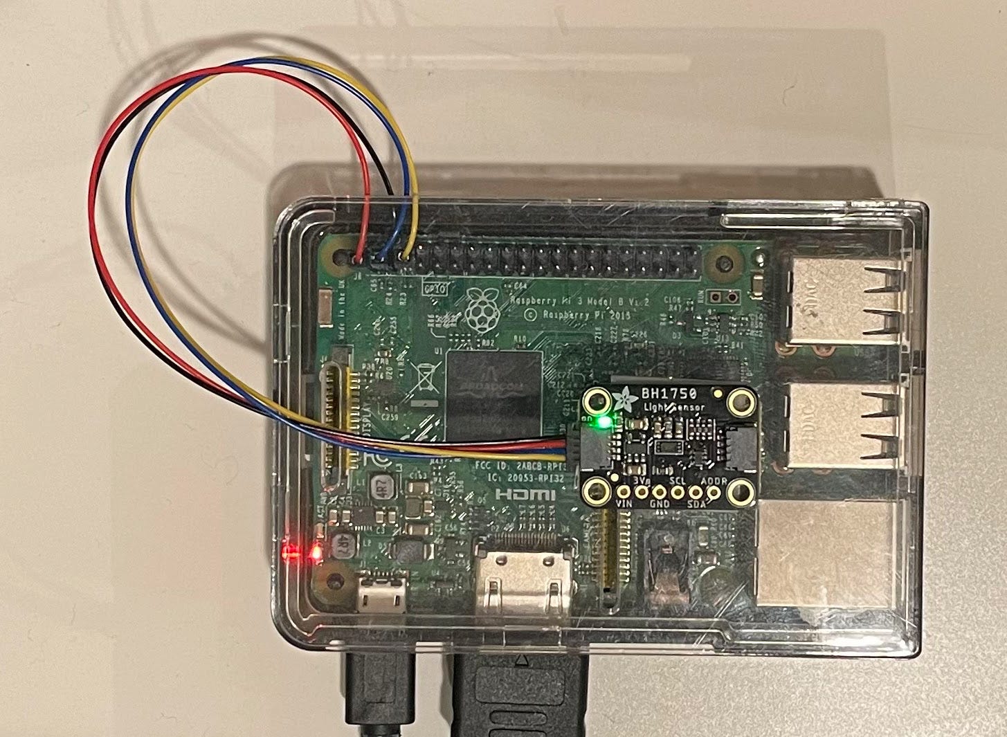 To solve the automated display control I used the BH1750 ambient light sensor. This sensor is connected via a few wires and just taped (serious engineering) on top of the pi case. Using the python libraries blinka and circuitpython I was able to add software support for reading the current light value as from the sensor.
